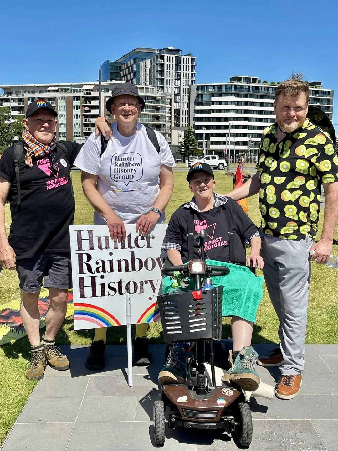 Hunter Rainbow History walked in the recent October 11 Newcastle Pride parade from Honeysuckle to Nobbys, led by Hellen Gollan and her young volunteers carrying the 78er’s banner.